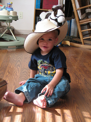 I got these pictures while the kids were playing with Ben's boots and and hat. The kids love to put his boots on and walk around the house when they can actually walk sometimes they put the boots on and have a hard time walking because they are so large and cover most of there legs. Patton loves to wear his dads cowboy hat and even though it is way to big he just looks so freaking cute in it. I just thought I would share this with you nothing big but oh well.